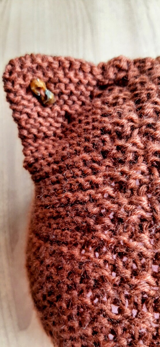 Когда я достигла желаемой высоты изделия, я аккуратно закрыла петли. Затем приступила к выполнению бокового шва, уделив внимание каждому стежку. На заключительном этапе я оформила ушки, придавая им аккуратную форму.